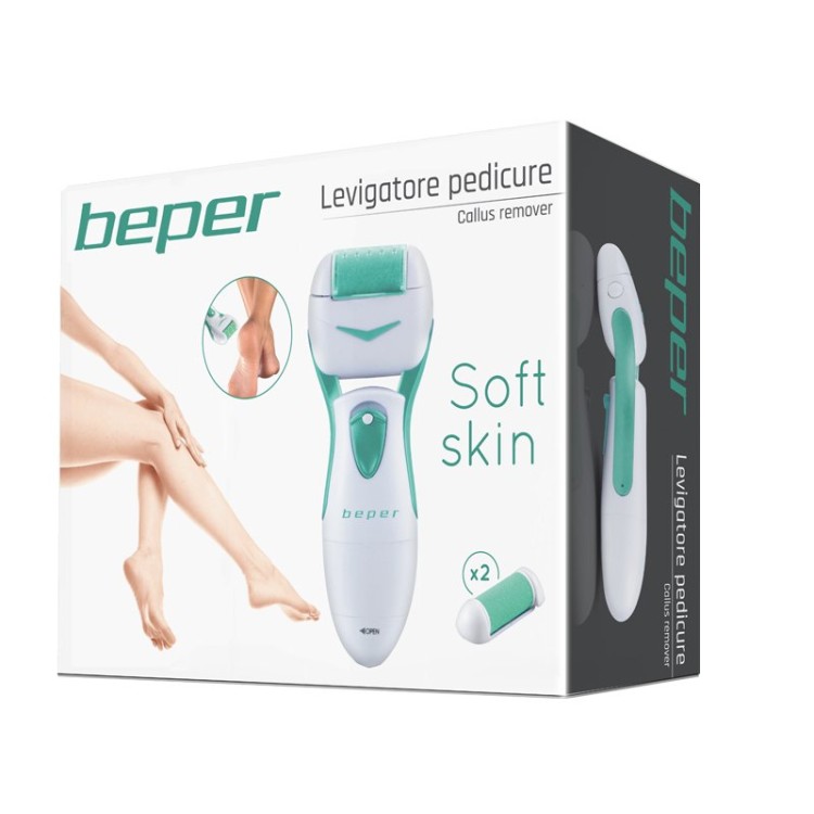 Battery-operated heel sander with silica sand head. Ideal for the removal of calluses and dry skin and to give the feet a pleasant feeling of well-being. Ergonomic handle for easy grip. Washable. Accessories: replacement head and cleaning brush.