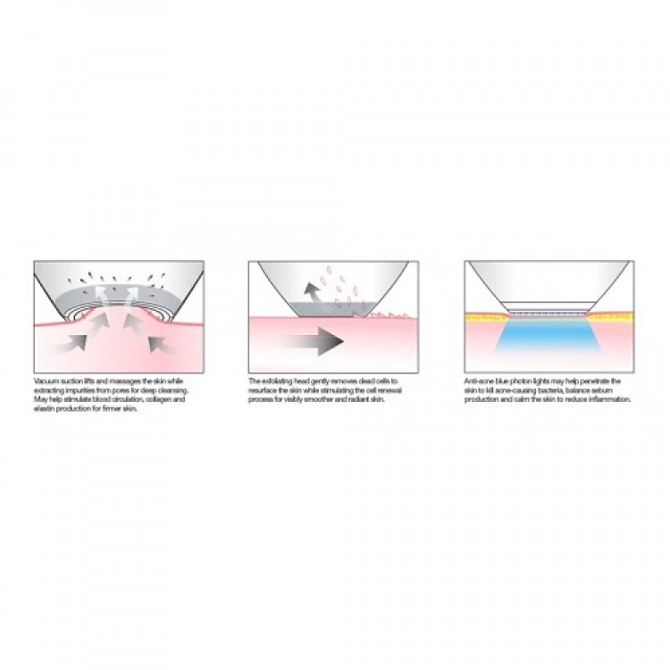 This device by Lifetrons Switzerland combines microdermabrasion, blue light photon therapy and negative ion massage into one beauty device.The blue photon light may help calm the skin, reduce oil, clear up blemishes and effectively treat mild to moderate acne.Microdermabrasion and vacuum suction technology help exfoliate dead skin cells and deep clean pores.Negative ion massage may enhance skincare nutrition absorption.
